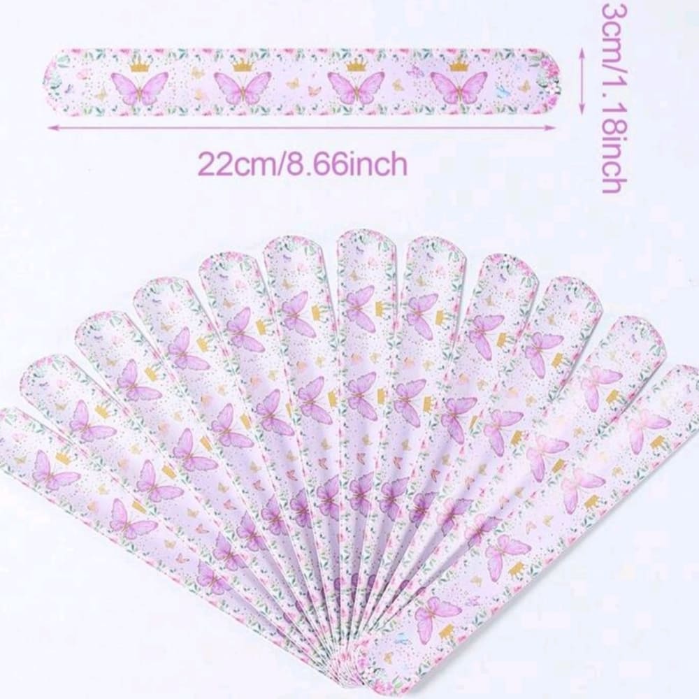 Add a fun little surprise to your party favours with these butterfly party favors slap bands. Featuring a pretty butterfly design with soft pink tones, these party bands are a lovely choice for butterfly-themed parties, fairy parties, princess celebrations and girls’ birthday parties.