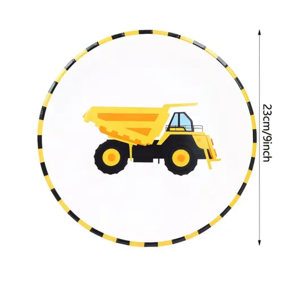 Construction Party Paper Plates Large, 10 Piece. Add a fun finishing touch to your construction-themed party table with this 10-piece set of large round paper plates featuring a yellow dump truck design with a black and yellow striped border.