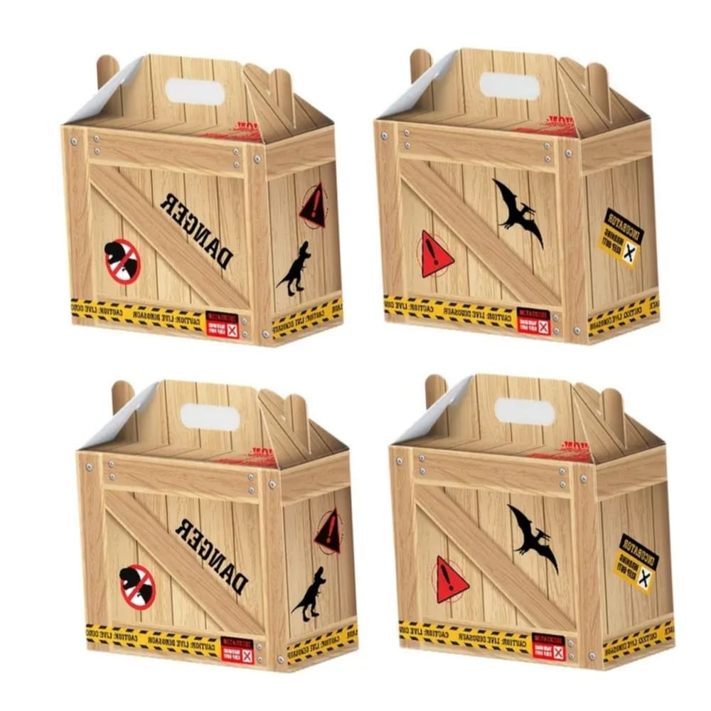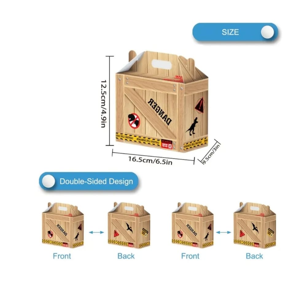 These party favor boxes are designed to look like wooden danger crates with dinosaur warning signs printed on both sides for extra detail.