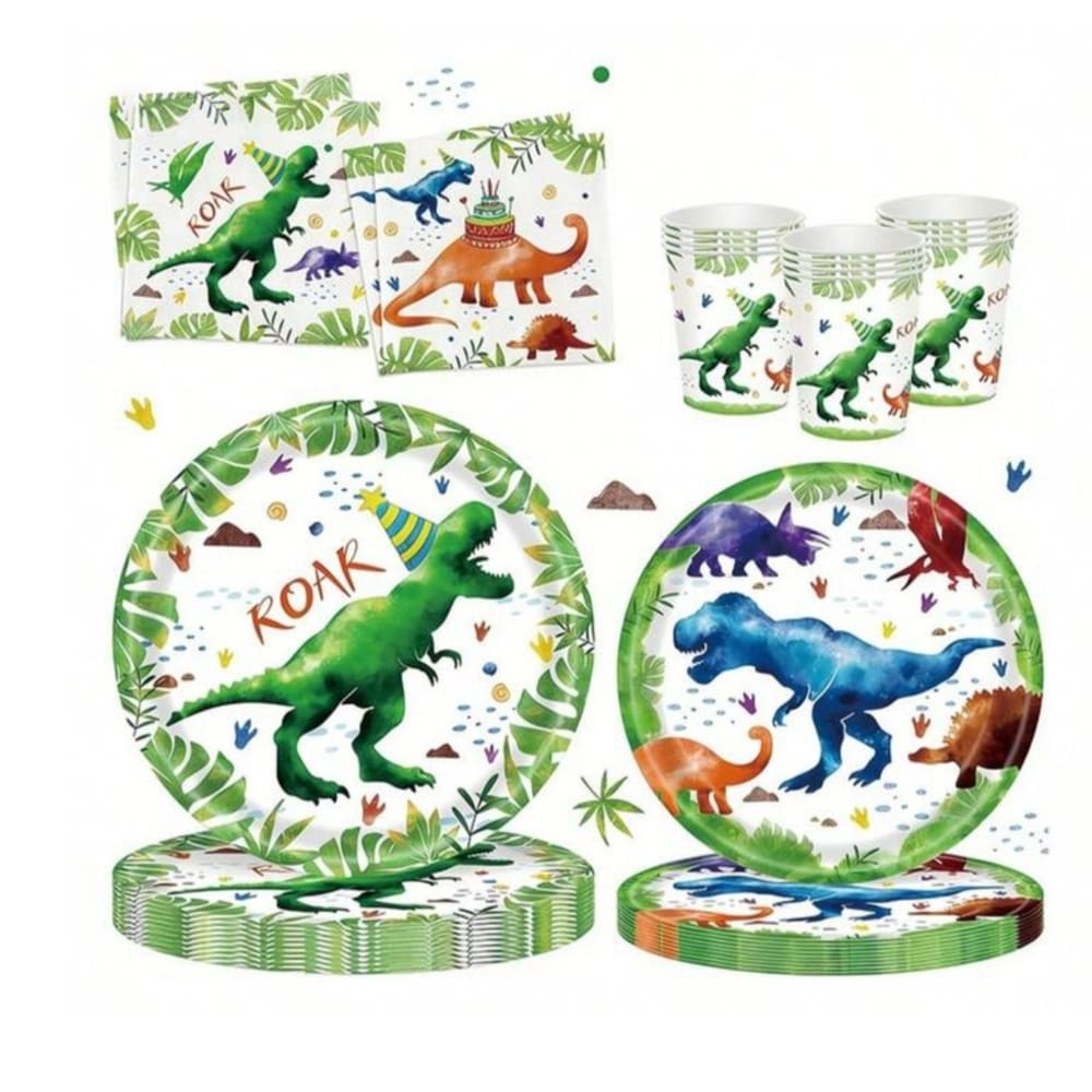Dinosaur Party Tableware Set includes 10 large paper plates, 10 small paper plates, 10 paper cups, and 10 paper napkins.