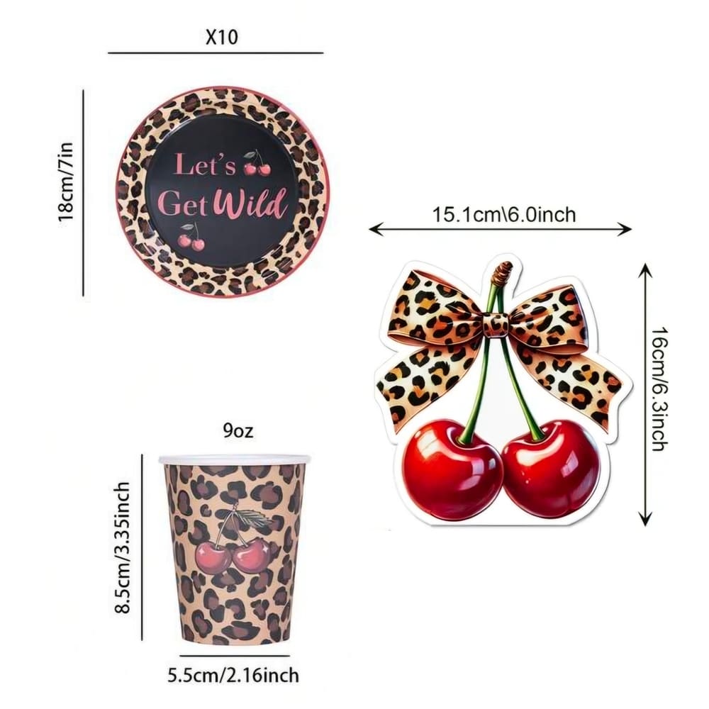 This leopard cherry party tableware set is a fun and fashionable choice for a party setup, featuring a mix of wild prints and playful cherry details.
