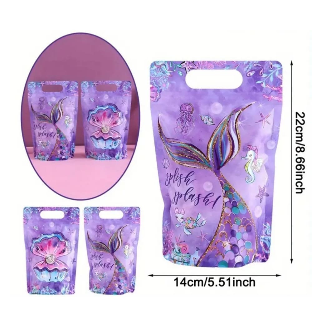 The set includes 6 resealable loot bags with two mermaid designs (3 of each). Each bag is double-sided printed and made from thick plastic with a zip-lock closure to keep contents secure. Bags are sold flat-packed so clients can fill them with their own treats.