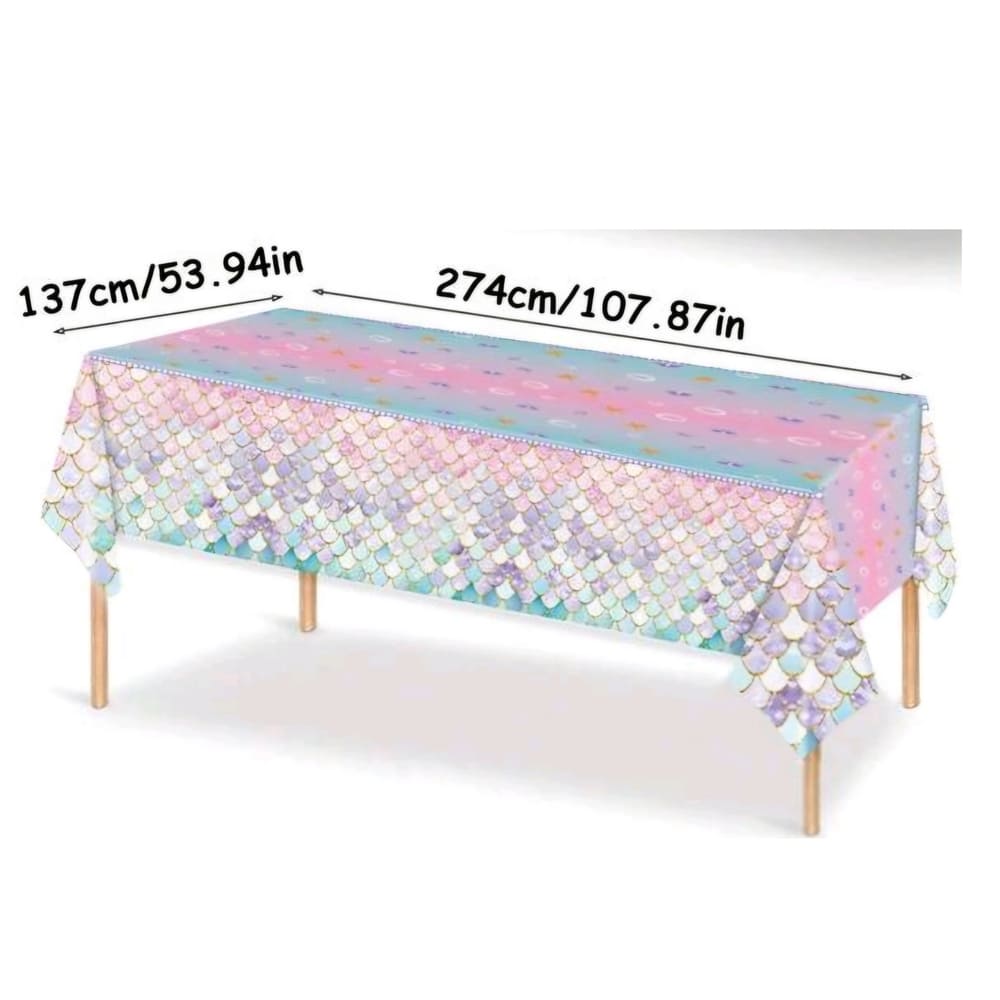 Mermaid Party Tablecloth – Pastel Scales Design (274cm x 137cm). Create a dreamy mermaid-inspired party setup with this pastel scallop tablecloth, perfect for cake tables, gift tables, or main party tables.