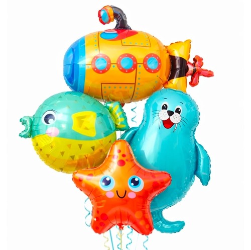 Bring underwater fun to your party décor with this colourful ocean adventure-themed foil balloon set, featuring a submarine, puffer fish, starfish, and seal design – perfect for sea life, ocean, or kids’ birthday parties.