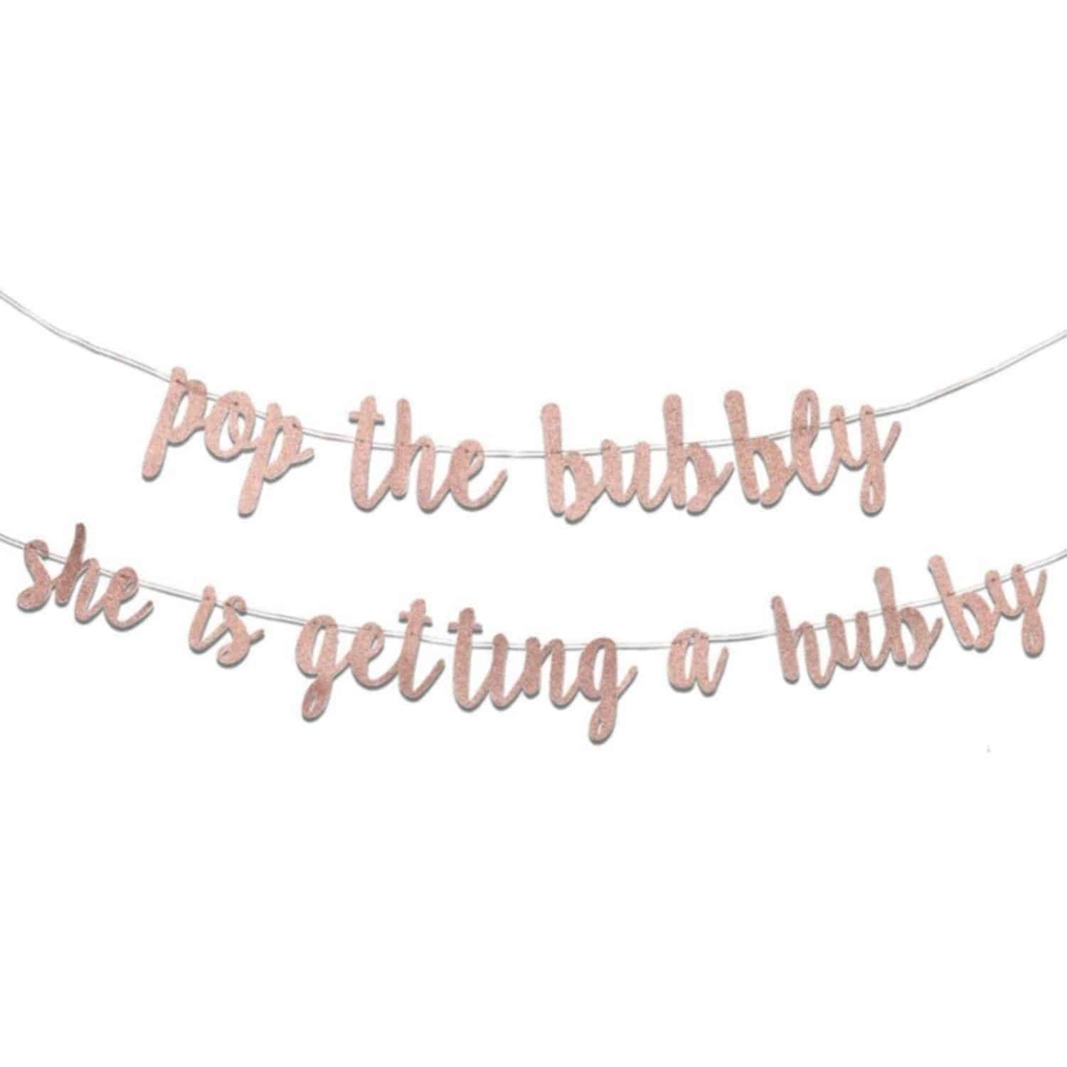 Pop the bubbly, she is getting a hubby! Make your bridal shower one to remember with this sparkling rose gold banner.