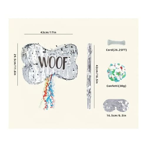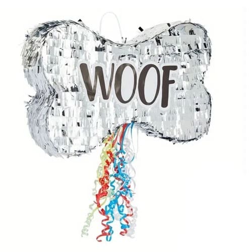 Add some tail-wagging fun to your celebration with this adorable puppy bone-shaped piñata set. Designed with shiny silver fringe and the word “WOOF”, this piñata is perfect for puppy, dog, or pet-themed birthday parties.
