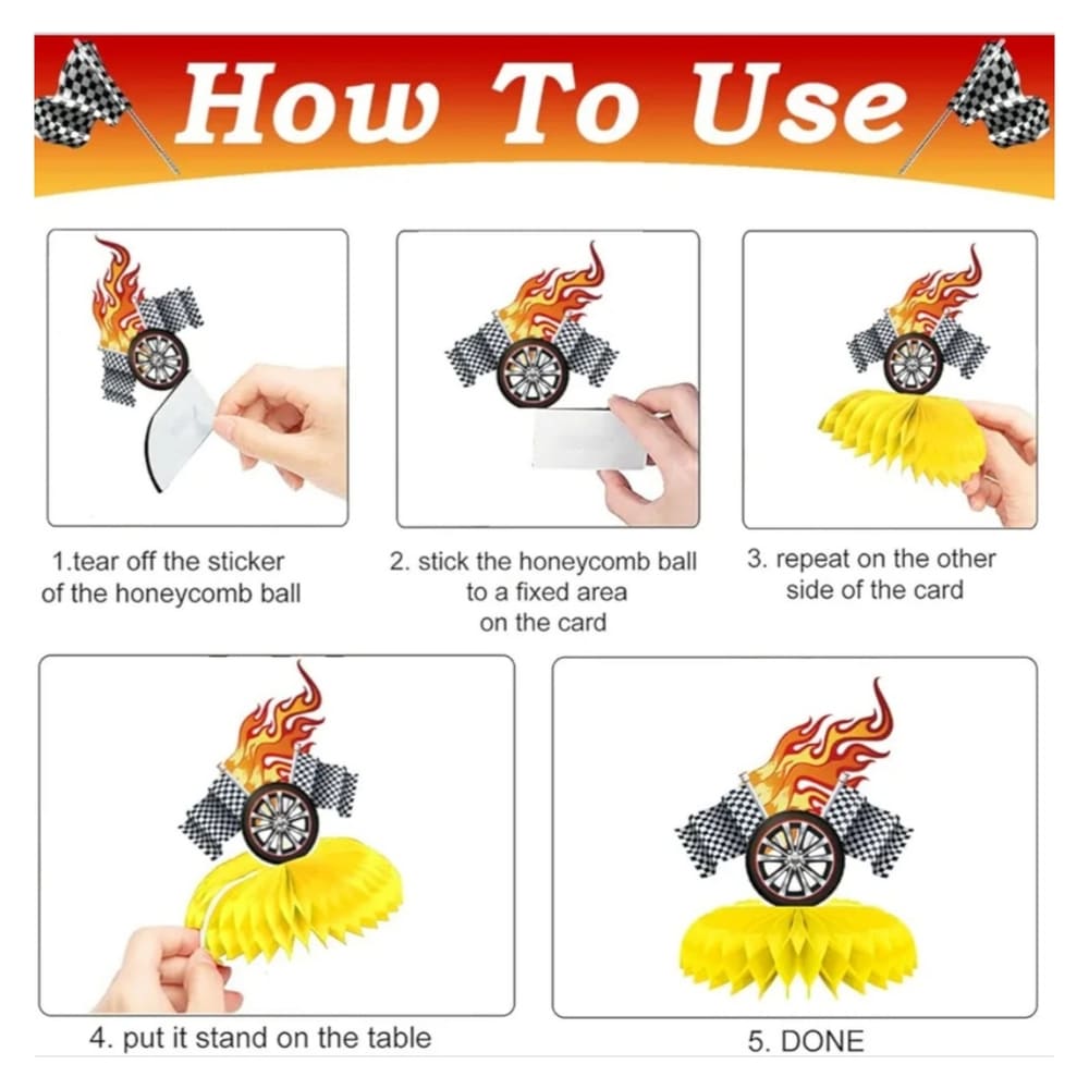 Race Car Honeycomb Table Decorations are fun party centrepieces for a racing car, race track, fast car or vehicle-themed birthday party.