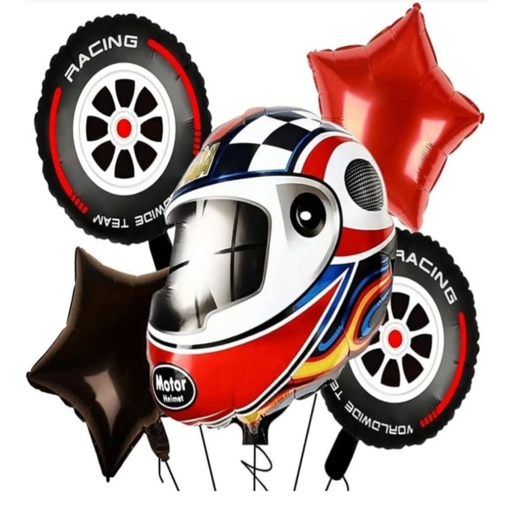 Buckle up as you unleash the power of these incredible balloons, featuring a helmet-shaped foil balloon, a tire-shaped foil balloon, and a bold black star-shaped foil balloon.