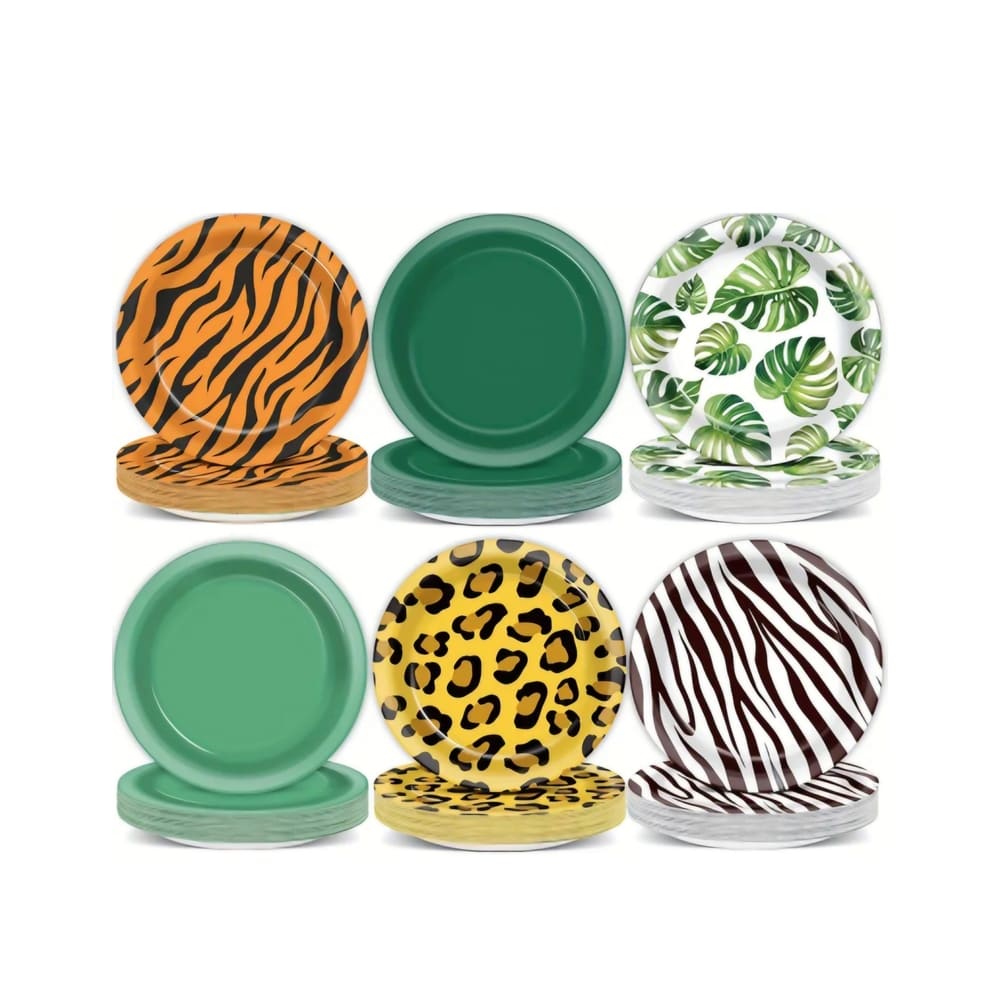 Safari Party Paper Plates – 6 Piece Mixed Designs (17 cm). These safari-themed paper plates bring a bold jungle feel to any celebration. You will receive 6 plates, one of each design, including animal prints and leafy patterns. Perfect for safari, wild one, jungle, zoo, or animal-themed parties.