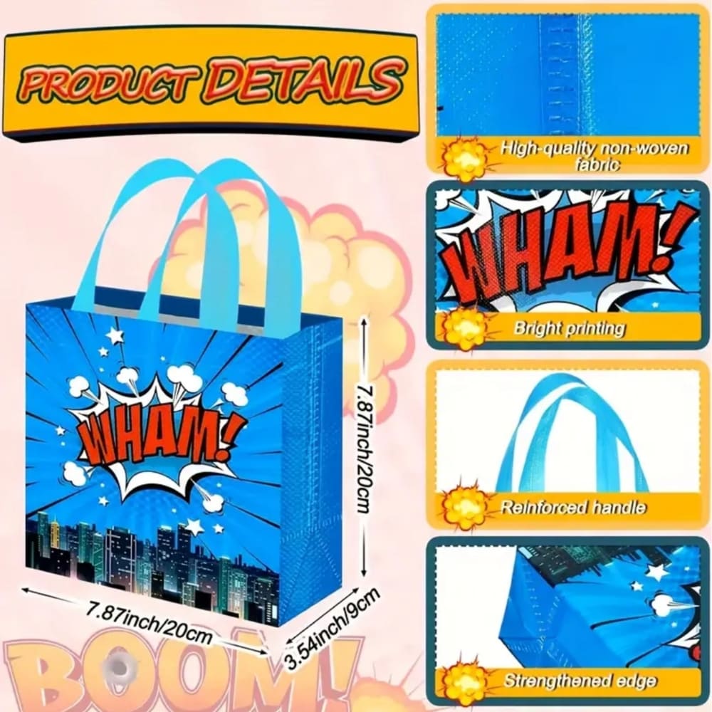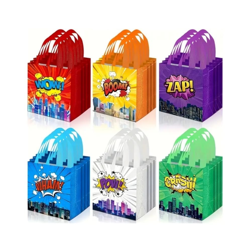 Sold as a six-piece set with 6 different designs. Made from non-woven fabric with reinforced handles, these bags are a practical and fun choice for superhero-themed parties.